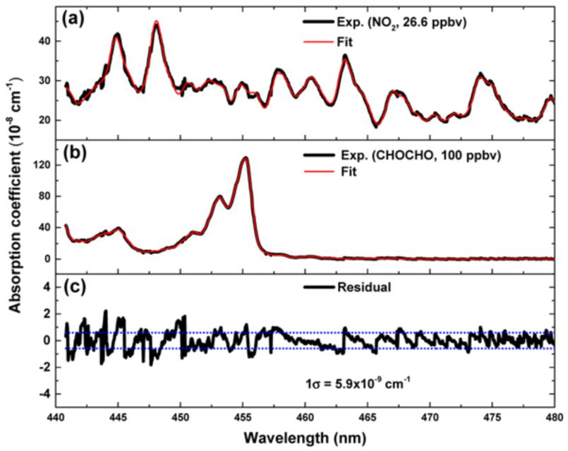 NO2(a)和CHOCHO(b)的宽带光谱信号及拟合残差(c)
