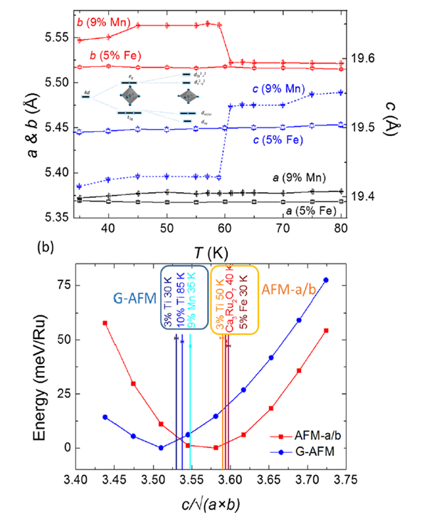 (a)由变温XRD谱获得的Ca3(Ru0.91Mn0.09)2O7和Ca3(Ru0.95Fe0.05)2O7晶格常数随温度的变化;(b)AFM-a/b和G-AFM总能量随晶格参数的变化