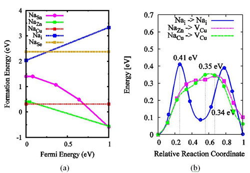 图1. CZTSe中与Na相关缺陷的形成能随费米能级的变化(a);Na的迁移路径(b)。