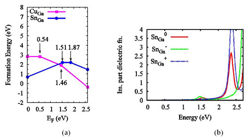 图2. CuGaS2中SnGa和CuGa的形成能随费米能级的变化曲线。箭头指示绝热电荷转移能级所在位置(a);CuGaS2中SnGa0、SnGa- 和SnGa+ 在子带隙能量区间的介电函数的虚部(b)。