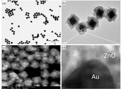 图1. Au@ZnO核壳纳米粒子(a) 低倍TEM图,(b) 高倍TEM图,(c) SEM图,(d) HRTEM图。