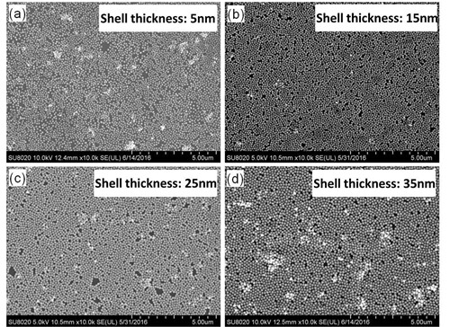 图2. 不同尺寸Au@ZnO核壳纳米粒子薄膜阵列的扫描电镜图。