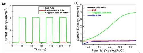 图3. Au@ZnO光阳极薄膜材料光电催化的 (a)电流-时间曲线,(b) 电流密度-电压曲线。