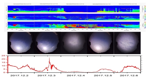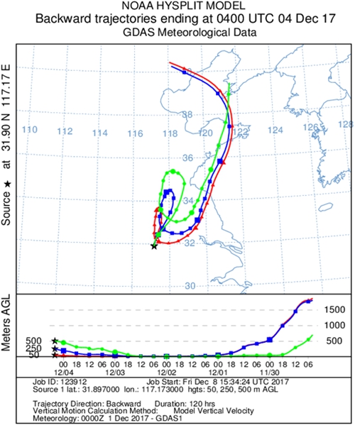 观测数据显示,12月4日凌晨4时严重污染出现,直至12月5日上午8时这次严重雾霾过程才缓慢结束,在重度污染时段,激光雷达的垂直探测深度只有几百至几十米,其颗粒物表现为球形大颗粒,推测是北方传输过来的颗粒污染物在华东地区停滞不前(美国NOAA后向轨迹分析图也显示这一特征),且与本地污染物、水汽等结合长大。本次污染过程中大气能见度急剧下降,全天空云图仪记录了雾霾过程天空状况,即使是中午时分天空也是模糊一片,对应的能见度在几百米至1公里左右。