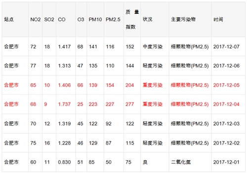 12月初,省城合肥遭遇了雾霾围城,尤其是12月4-5日,空气质量指数AQI一直居高不下, 一度成为全国最污染城市。究其原因,本次污染过程主要受北方重污染传输影响,加之本地污染积累、不利气象扩散条件等因素,导致PM2.5浓度持续处于重度污染的指标范围。