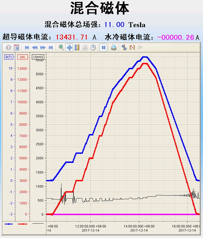 12月14日,中科院强磁场科学中心混合磁体的外超导磁体调试达到11特斯拉磁场强度,这是在稳态强磁场装置于2017年9月27日圆满完成国家竣工验收后,其磁体装置性能提升实验取得的新的重要进展。在竣工验收时,该混合磁体的外超导磁体实现了国家任务指标——10特斯拉,而混合磁体装置顺利实现了40特斯拉任务指标。