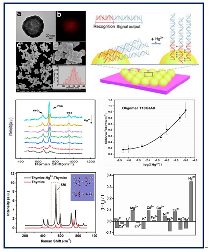 表面增强拉曼光谱(SERS:surface enhanced Raman spectroscopy)作为一种正在快速发展的技术,因其快速、无损和痕量检测等特点得到广泛关注并开始走向实际应用。汞是一种毒性极强的重金属,对人体及生物体有很大的危害。Hg(II)作为汞在环境中的一种常见的存在形式,对其进行快速、可靠、有效测量具有必要性和迫切性,但是基于SERS技术对其特异性和相对定量检测还存在一定难度。为此,黄青研究员等设计了一种能够有效的捕捉水样中的汞离子并产生拉曼散射增强效应的纳米粒子-适配体复合检测体系。课题组研究人员在SiO2@Au纳米粒子表面修饰上能有效捕获汞离子的DNA适配体,利用DNA分子中T碱基和Hg(II)形成T-Hg2+-T结构的特性,能够高效捕获Hg2+,并产生SERS信号改变。实验结果表明,在加入Hg(II)后,设计DNA分子中的腺嘌呤(A)产生736cm-1SERS信号与鸟嘌呤(G)产生的位于660cm-1的SERS信号的峰强的比值会随检测Hg(II)浓度增加而减小,并出现一些特征新峰,如550cm-1。计算表明,它来源于汞离子取代了T上的H在两个DNA分子间形成N-Hg-N结构而发生的伸缩振动。利用这些变化,我们由此可以对Hg(II)的进行快速、特异性和半定量的痕量检测。