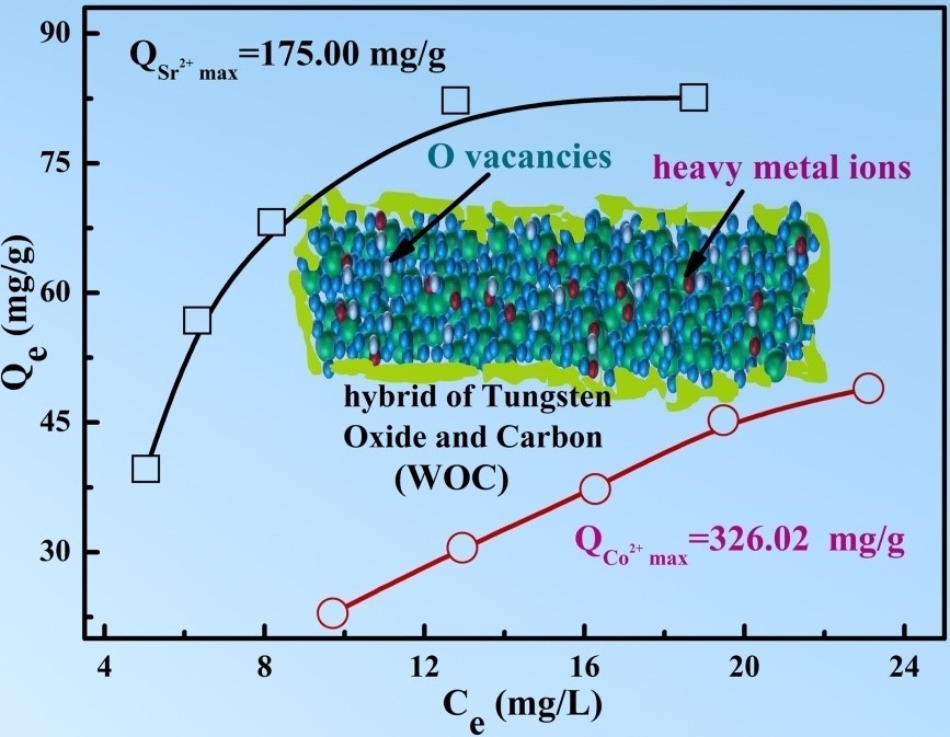 W18O49具有很多优点,例如:均匀多孔、强耐酸性、高热稳定性、低细胞毒性等。其中,W18O49表面存在的丰富的氧空位能为金属离子的固定和络合提供活性位点。另外,通过在其表面嫁接有机含碳官能团形成了WOx/C纳米线网络,由于其疏松的空间结构,材料的比表面积大,这进一步增加了其对金属离子的固定能力。实验结果表明,WOx/C能够实现酸性条件下对Sr(II)和Co(II)的高效富集,尤其是Co(II),能够在十分钟之内达到吸附平衡。通过对其吸附机理的研究发现,WOx/C表面的氧空位和官能团C-O对金属离子的络合起关键作用。WOx/C的制备简单环保,对核素离子的吸附量大,在放射性水污染处理领域有广阔的前景。