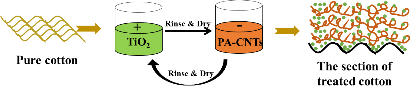 科研人员首先分别制备了二氧化钛与碳纳米管的正负电解质溶液,之后采用层层自组装(layer-by-layer self-assembly)技术,将二者交替构筑在棉纤维织物上(制备过程如图1所示)。一方面,以棉纤维织物作为负载基体,赋予其良好的易回收特性,实现了纳米光催化材料的循环再利用;另一方面,棉织物丰富的多孔结构促进了各类污染物在其表面的吸附,延长了光催化剂和污染物的接触时间,大幅提高了光催化材料的降解效果。