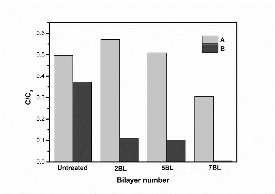 在前期工作中,课题组利用新型的层层自组装技术构筑了一系列绿色环保的功能棉纤维织物涂层,如具有快速自熄、高效防火的棉织物涂层,绿色防火与高效抗菌与一体的双功能棉织物涂层等。相关成果发表在Cellulose 上并授权了两项国家发明专利。考虑到棉织物疏松多孔的结构特点及亲水、天然、广泛应用的优势,课题组以其为负载模板,成功构筑了纳米光催化织物涂层,实现了纳米光催化材料的回收再利用,并且通过纳米光催化材料的交替层层组装,大幅提高了光催化效率。