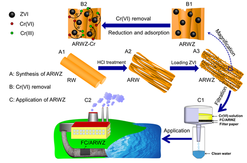 课题组对废弃岩棉进行系列物化改性,制备出具有大量微纳孔隙及功能基团的载体材料。该材料可大幅提高纳米铁的分散性,其装载纳米铁制备出新型重金属修复剂。该修复剂可高效抓取并还原六价铬,控制其迁移,从而抑制作物对铬的摄取,提高粮食安全性。为了促进其工业化应用,我们将该修复剂作为滤芯研制出新型过滤系统,为含铬工业废水处理提供轻简化解决方案。该方法工艺简单、成本低、可重复利用,为水体和土壤重金属污染治理提供有效技术供给,同时为废弃岩棉循环利用提供了一种新途径。