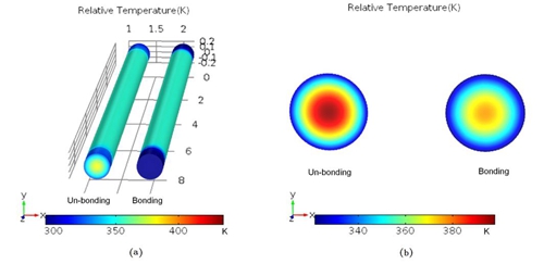图2 Cr,Er,Pr:GYSGG和键合GYSGG /Cr,Er,Pr:GYSGG激光棒的热分布 (a)晶体棒表面的热分布;(b)键合面位置的热分布