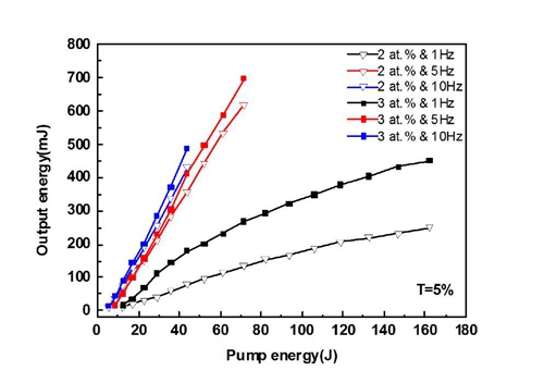 此外,Cr,Er:YSGG是目前发展较为成熟的中红外激光晶体,Cr3+离子掺入后能够提高晶体的闪光灯泵浦效率,但Cr3+离子掺杂浓度还有待进一步优化。该课题组采用提拉法生长出两种不同掺杂浓度的Cr,Er:YSGG晶体,并对其吸收、荧光光谱、能级寿命及激光性能进行了对比研究,结果表明,在3at% Cr3+浓度掺杂的晶体中,其输出功率、激光斜效率等参数均有较大提高。