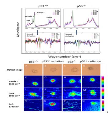 p53是细胞内重要抑癌基因,参与细胞代谢、DNA损伤修复、周期阻滞、细胞凋亡等过程,在电离辐射引起细胞损伤效应中,p53也发挥重要作用。但是,目前人们对p53调节相关辐射效应的过程并不很清楚,这其中需要对细胞在辐照后的化学反应过程进行观测和分析。傅里叶变换红外光谱因其简单、快速、无损检测等优点已被广泛应用于生物学研究,它可以对细胞中的蛋白质、核酸、脂类等变化进行快速定性和定量分析。随着现代红外光谱技术发展,现在研究人员已经可以应用红外显微光谱工具对单细胞进行分析,这为了解细胞的状态及反应过程提供了有力工具。