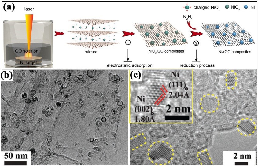 图1 (a) 是Ni/rGO的合成示意图;(b) 和 (c) 分别是Ni/rGO的低倍和高分辨透射图片。
