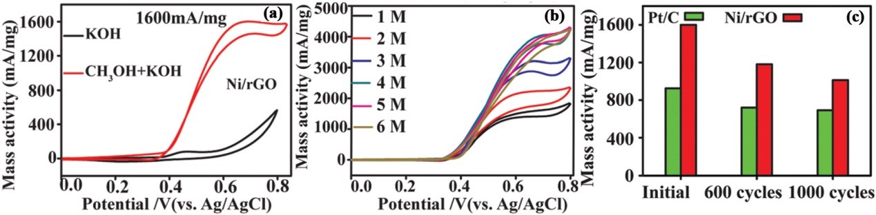 图2 (a) 是Ni/rGO分别在1M KOH和1M CH3OH+KOH溶液中的循环伏安图;(b) 是Ni/rGO分别在1-6M CH3OH+KOH溶液中的循环伏安图; (c) Ni/rGO和商用Pt/C催化剂在不同循环次数下的质量活性对比。