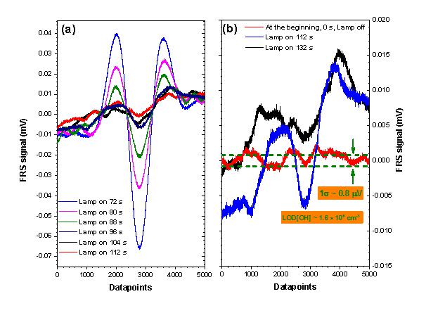 图2 臭氧光解实验过程中的OH自由基FRS信号变化:(a)反应不同时刻的FRS信号;(b)反应临近结束时的FRS信号。