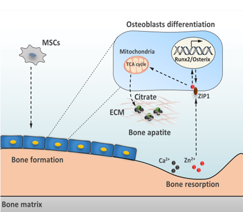 间充质干细胞(MSC)是具有自我更新和多向分化潜能的干细胞,临床上被广泛应用于多种疾病的细胞治疗,特别在骨修复与再生方面起到了重要的作用,柠檬酸盐是骨微结构磷灰石纳米晶体的重要成分,影响骨的强度、硬度及韧性,然而骨中柠檬酸盐的产生和沉积机制尚不清楚。MSC分化与细胞糖脂代谢密切相关,柠檬酸是细胞线粒体三羧酸循环的重要中间产物,本研究中,该联合团队利用液体与固体核磁共振技术,通过13C同位素标记追踪及靶向代谢组学方法发现磷灰石中的柠檬酸盐来源于MSC成骨分化后期三羧酸循环过程的葡萄糖氧化代谢中间产物,并揭示MSC吸收利用锌离子调节成骨分化的Runx2/Osterix/ZIP1分子信号机制,此正反馈通路进一步促进了柠檬酸盐沉积与骨磷灰石形成。该研究首次发现了骨微结构中柠檬酸盐的产生来源,揭示了代谢调控及代谢中间产物参与骨形成的新机制,同时为锌离子作为活性成分制备骨修复新材料提供了重要理论依据。