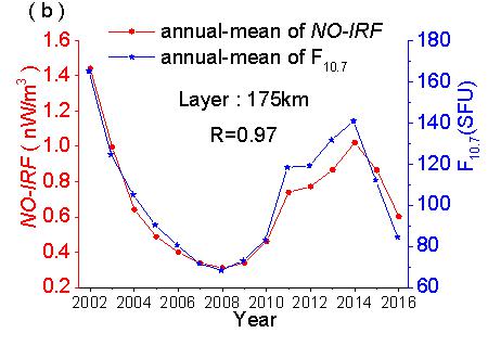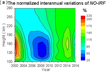 虽然一氧化氮(NO)在地球热层大气组成成分中仅占有很少的百分比,但是NO在5.3 微米波段的红外辐射却是热层大气中的红外辐射冷却的一个重要过程,该过程在中高层大气红外辐射能量收支中起着重要作用,尤其在热层的风暴期间, NO的红外辐射冷却过程尤为重要,它直接影响到大气的热结构,表现出很强的太阳地球空间耦合特性。中高层大气的能量平衡和热结构主要受太阳活动循环周期的控制,太阳辐射提供了热层大气系统各种动态过程的外部强迫动力过程,因此热层大气中NO辐射通量变化主要是受到太阳活动影响。NO红外辐射是地球上空的重要“保温被子”,是高层大气状态和空间环境的重要物理参量,而热层也是低轨道卫星所在的临近空间。所以,高层大气成分和辐射分布的研究已是业界关注的热点之一。此外,太阳11年周期性活动对热层空间环境的大气物理、化学以及传输等有着重要的影响,系统研究地球热层NO红外辐射通量的全球分布以及太阳活动和地磁活动对其空间分布的长期影响对进一步认识高层大气空间环境有着重要意义;对于确定高空大气的动力学和能量收支以及低轨道卫星的临近空间环境评估也具有重要意义。