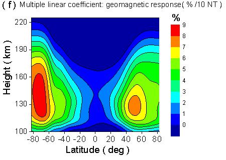 图1 热层一氧化氮(NO)红外辐射量的全球分布和时空变化,以及太阳活动和地磁活动对其变化的影响. (a) 热层大气的NO红外辐射量的年际相对变化; (b) 在175km高度层的NO红外辐射量和太阳活动指数的年际变化; (c) 热层NO红外辐射量对太阳循环周期的依赖性分析; (d) 热层NO红外辐射量对地磁活动的依赖性分析; (e) 热层NO红外辐射量对太阳活动响应大小的空间纬度分布; (f) 热层NO红外辐射量对地磁活动响应大小的空间纬度分布