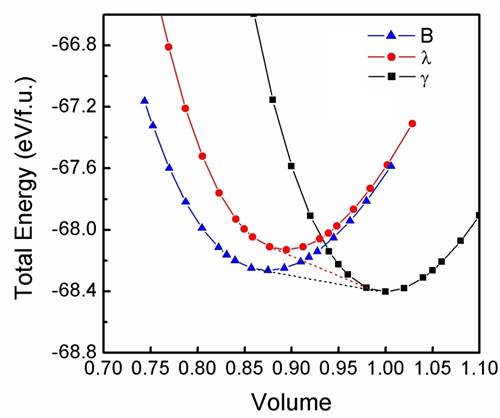图2. B, λ, γ-Ta2O5的能量-体积函数关系图以及结构相变示意 (虚线)