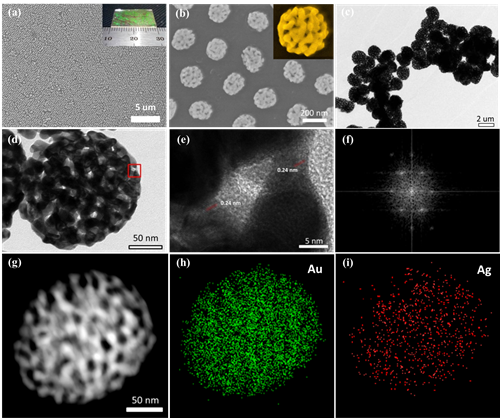 (c)-(f) 多孔Au-Ag合金纳米球的TEM、HRTEM及其傅里叶转换照片;(g)-(i) 多孔Au-Ag合金纳米球HAADF-STEM照片和元素分布图。