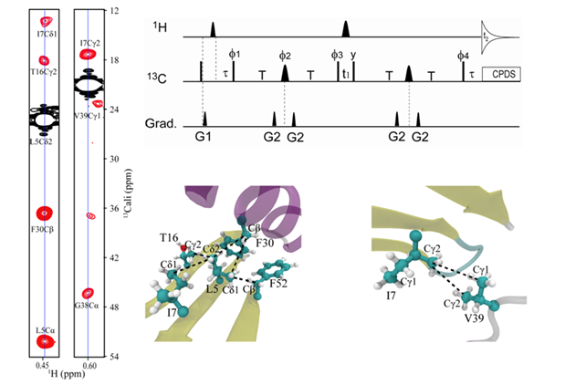 该研究以IgG结合蛋白质GB3为研究对象,通过对亮氨酸、异亮氨酸和缬氨酸的甲基进行[13C, 1H]选择性标记(对其它氨基酸进行[13C, 2H]标记),设计HMQC实验脉冲序列,利用其较长的径向弛豫时间来实现磁化矢量从甲基碳原子到脂肪族侧链碳原子上的传递(图1),从而实现跨范德华力的JCC-耦合常数测量(数值在~0.1-0.6 Hz之间)。进一步的量子力学计算表明,跨范德华力的JCC-耦合常数与范德华力的交换互斥力组分正相关(另一重要范德华力组分是色散作用力)。