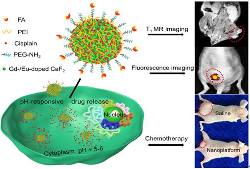 针对该问题,课题组制备出一种Gd/Eu掺杂的CaF2纳米簇,可用于MR/荧光双模式成像,有助于精确定位肿瘤。同时,装载顺铂后,该纳米系统展现出显著的酸敏控释性能和抗肿瘤效果,对于实现临床癌症精准诊疗具有潜在的应用前景。