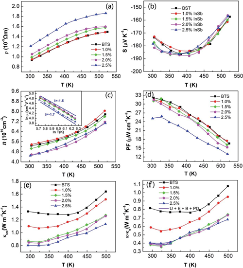 图2 复合体系Bi2Te2.7Se0.3-f(InSb) (f = 0,1.0,1.5,2.0和2.5 vol%) 的 (a) 电阻率;(b) 热电势;(c) 载流子浓度;(d) 功率因子;(e) 热导率以及 (f) 晶格热导率随温度的变化关系。