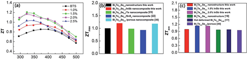 图3复合体系Bi2Te2.7Se0.3-f(InSb) (f = 0,1.0,1.5,2.0和2.5 vol%) 的 (a) ZT值与温度对应关系曲线;该体系中 (b) 最高ZT值及 (c) 平均ZT值与文献报道值的对比关系图。