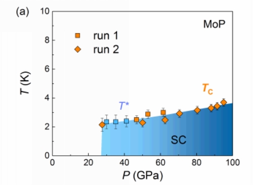 固体所迟振华副研究员与杨昭荣研究员研究团队合作,在自主搭建的高压综合测试平台上对物理所石友国研究员课题组提供的MoP单晶进行了系统的高压研究,实验结果表明:MoP在30 GPa左右从拓扑半金属转变成超导体,临界转变温度Tc为2.5 K左右,随着压力增大,Tc也随之升高,在95 GPa时升高到4 K。另外,在60 GPa以下,MoP的晶体结构非常稳定,表明受晶体结构对称性保护的拓扑非平庸电子态和超导态在30~60 GPa范围内有可能共存,实验结果与强磁场科学中心杨晓萍研究员的理论计算结果吻合。相关结果也为拓扑超导的实现提供了一种新的思路。