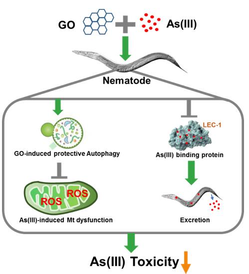 近期,该课题组将GO的这种解毒潜能进一步拓展延伸至重金属污染物砷(arsenic,As),在秀丽隐杆线虫体内揭示了GO拮抗As(III)毒性的作用机制(图1)。研究结果显示,在GO预处理和GO与As(III)同时处理两种暴露方式下,GO均能降低As(III)诱导的生殖毒性。进一步的机制探究表明,除了吸附As(III),GO同样可以在线虫体内通过诱导具有保护作用的细胞自噬效应来降低As(III)引发的氧化应激以及线粒体损伤。利用激光烧蚀电感耦合等离子体质谱仪(LA-ICP-MS)和线虫的功能缺失突变体,研究人员发现,GO通过抑制线虫体内的As(III)特异性结合蛋白(半乳糖凝集素-1,LEC-1)的表达从而加速了As(III)从线虫体内排出。上述工作为深入探究环境中GO与污染物复合暴露的机制奠定基础,也为环境污染物的治理和解毒提供了新的研究思路。
