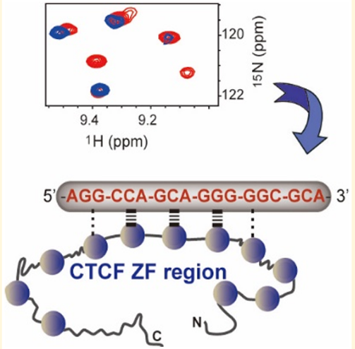 研究课题组因此将CTCF的11个串连锌指区域作为一个整体,利用液态核磁共振的方法得到了CTCF ZFs 1-11的化学位移指认,并解析了每一个锌指的核磁结构。据了解,这是核磁目前解析的具有最多数目结构域的蛋白质。进一步的核磁主链动力学、残余偶极耦合和小角X射线散射实验证实了在未结合核酸状态下,CTCF ZFs 1-11具有相当的柔性。来自于原钙粘蛋白基因簇的两段不同DNA片段和CTCF ZFs 1-11的核磁结合实验表明CTCF采用不同区段锌指、以不同的结合强度进行应答;结合CTCF ZFs 1-11的化学位移指认,从而可系统性地研究染色质上的不同DNA结合位点与CTCF的互作模式。该研究对于阐释CTCF与多种DNA结合的分子机理以及其结合过程中CTCF蛋白的构象变化有重要意义。