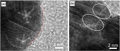 图2. AuAgPt三元合金纳米球的HRTEM图。 (a) 颗粒中存在的孪晶界和高指数晶面;(b) 晶格畸变的局部放大图。