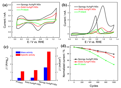 图3. AuAgPt三元合金纳米球、实心AuAgPt合金纳米球和铂黑甲醇电催化性能测试。(a) 在氮气饱和的0.1 M HClO4 溶液中测试得到的循环伏安图;(b) 在0.1 M HClO4 + 0.2 M甲醇溶液中测试得到的甲醇氧化曲线;(c) 不同催化剂的甲醇氧化活性对比柱状图;(d) 稳定性测试对比图。