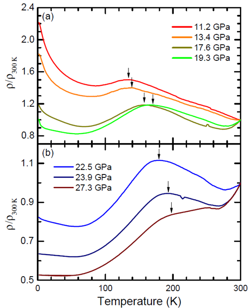 图1. MoS2的电阻-温度曲线。(a)为半导体区域, (b)为金属区域,其中箭头为电阻-温度曲线上的鼓包。