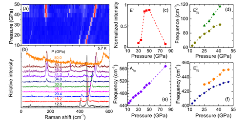 图2. 二硫化钼在5.7K不同压力下的拉曼散射结果。 (a) 在拉曼频率-压力坐标下的拉曼散射强度二维图。 (b) 5.7K不同压力的拉曼散射光谱。 (c) 5.7K下E′峰的强度随压力的变化以及E22g (d) A1g (e) 和E1 2g (f)模式的频率随压力的变化。