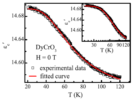 图1. DyCrO3单晶c轴方向介电常数随温度的变化及其根据Barrett方程的拟合结果