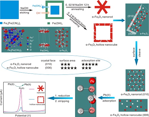 图1. Fe2O3纳米棒和空心纳米块的合成以及重金属离子在其表面的作用方式和实现对Pb(II)检测的示意图