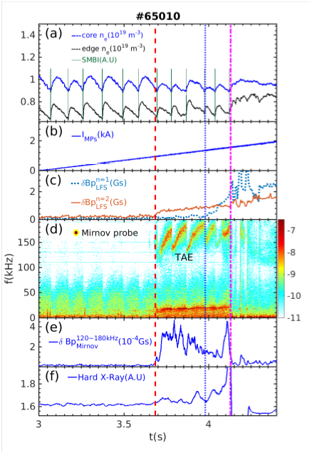 课题组首次在EAST托卡马克中发现了外加的静态三维磁扰动对环形阿尔芬本征模的激发作用。其中外加的三维磁扰动在n=2渗透之后首先会激发出浅捕获的高能电子,随后这些高能电子会进一步共振驱动一支环向模数为n=2的沿着离子逆磁方向传播的环形阿尔芬本征模。相应频段的浅捕获高能电子对应的能量和硬X射线能谱诊断测量到的光子能谱有非常好的对应关系,说明这支环向阿尔芬本征模是由浅捕获的高能电子驱动的。该研究结果显示外加的三维磁扰动场或许可以作为一种主动控制阿尔芬本征模的手段,应用到未来主要运行低碰撞率燃烧等离子体的ITER等聚变装置中。