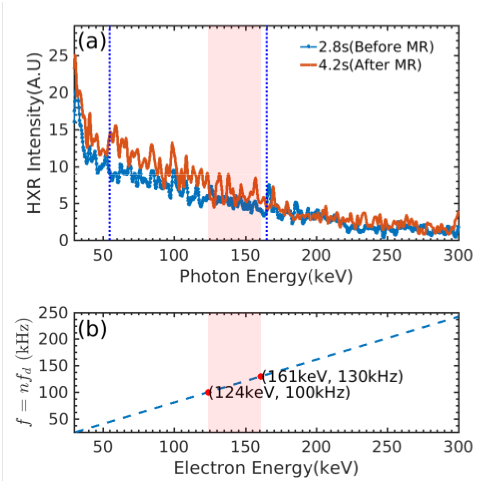 相应频段的浅捕获的高能电子能量范围和硬X射线诊断的光子能谱结果一致