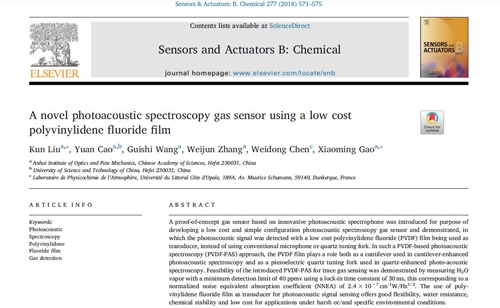 近期,安光所高晓明研究团队刘锟副研究员在悬臂式薄膜光声光谱技术研究方面取得了新突破,相关研究工作以“A novel photoacoustic spectroscopy gas sensor using a low cost polyvinylidene fluoride film”为题在Sensors and Actuators B: Chemical期刊(一区,IF: 5.6)上在线发表。