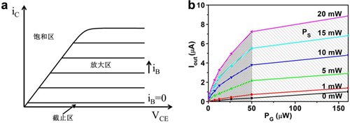 这表明,Ag/TiO2复合薄膜在外加两束光照射后,具有类似于三极管的特性。众所周知,三极管是半导体基本元器件之一,具有电流放大作用,是电子电路的核心元件。三极管有三个电极,分别是基极、发射极和集电极。通常情况下,在三极管中,电信号从基极输入,从集电极输出,它的输出特性曲线如图2a所示。研究发现,当近红外光作为源极信号光输入,复合薄膜将这种近红外光转换成电信号输出,在此基础上,再外加紫外光照射到复合薄膜上,可以调控输出的电信号,输出特性曲线如图2b。比较图2b与图2a可见,Ag/TiO2复合薄膜的输出特性曲线与三极管的输出特性曲线非常相似,因此,将这种Ag/TiO2复合薄膜称作全光输入的晶体管。值得一提的是,这种光电器件只需要两束光输入,不需要外加电驱动。