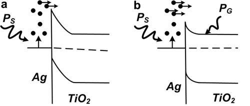 图3. Ag/TiO2复合薄膜的光电响应过程能带图:(a) 近红外光(PS)激发的热电子越过高肖特基势垒,(b) 近红外光(PS)激发的热电子越过被紫外光(PG)降低后的肖特基势垒。