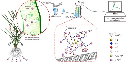 这项研究利用简单易制备的纳米材料实现对水稻伤流液中重金属离子的高灵敏、选择性电化学检测。这将可能为水稻植株的根,茎,叶和果实中重金属离子的检测提供一种简单有效的方法,对进一步研究水稻中重金属离子的迁移和转化有着重要意义。