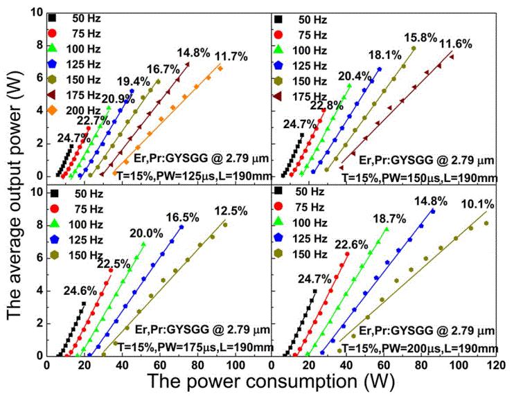 在前期研究工作的基础上,该课题组采用966nmLD侧面泵浦方式,进一步研究了Er,Pr:GYSGG晶体的激光性能。在重复频率为125赫兹、脉冲宽度200微秒条件下,实现了最大输出功率8.86瓦、电光效率和斜效率分别为7.7%和14.8%的激光输出。结果表明,通过掺入退激活离子Pr3+和LD侧面泵浦,可获得高性能的2.79 微米激光。