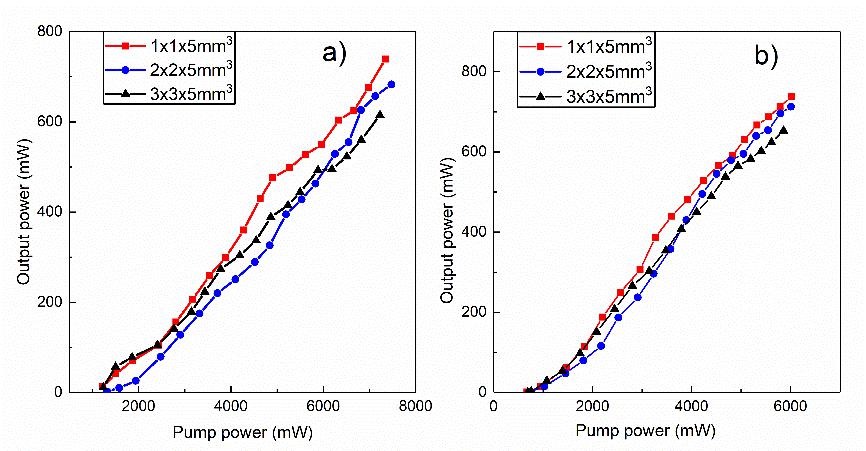 图5 不同尺寸与泵浦功率条件下的激光输出功率 (a) 973 nm LD 连续模式下泵浦;(b) 962 nm LD 连续模式下泵浦