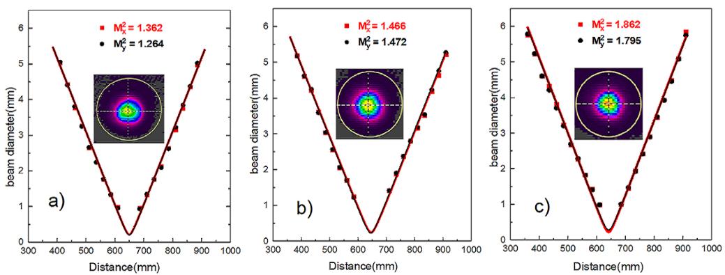 图6 不同尺寸Er:YAP晶体的光束质量因子M2 (a) 1×1×5 mm3; (b) 2×2×5 mm3; (c) 3×3×5 mm3