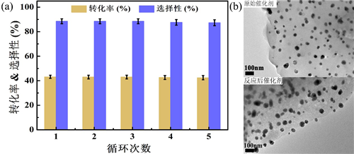 图3. 催化剂循环稳定性能评价 (a) 反应活性及选择性,(b) 反应前后TEM图像