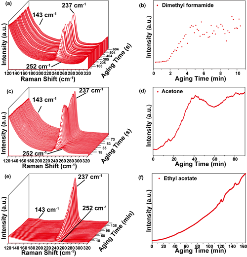 以Se胶体为例,为避免表面活性剂、反应残留离子对纳米晶生长造成的干扰,课题组研究人员首先采用液相激光熔蚀技术在去离子水中熔蚀Se靶,得到了红色无定形态的a-Se纳米胶体溶液。随后将Se纳米颗粒离心收集,再分别分散到三种不同的极性非质子溶剂二甲基甲酰胺(DMF)、丙酮(CP)和乙酸乙酯(EAC)中陈化生长(图1)。利用平台中的液相原位拉曼光谱监测发现(图2),随着陈化过程的进行,三种溶剂中a-Se(252cm-1)逐渐减少,t-Se(237cm-1)逐渐增加。通过对t-Se拉曼峰强度与陈化时间之间关系进行分析模拟,研究人员观察到不同溶剂中Se的相变速率是不同的。三种溶剂中,Se相变速率大小为DMF>CP>EAC。进一步对t-Se(237cm-1)拉曼峰强度和陈化时间的散点图进行函数拟合,结果表明,不同溶剂中,从a-Se到t-Se的相变生长速率与时间呈幂函数关系,且与溶剂分子极性呈正相关关系。